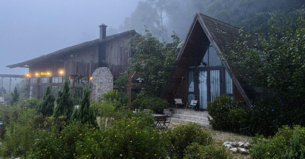 Homestay nhìn vừa đẹp vừa bí ẩn trong màn sương sớm.