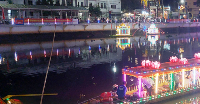 Thả đèn nước và ghe Cà Hâu tại Sóc Trăng tối 12/11.