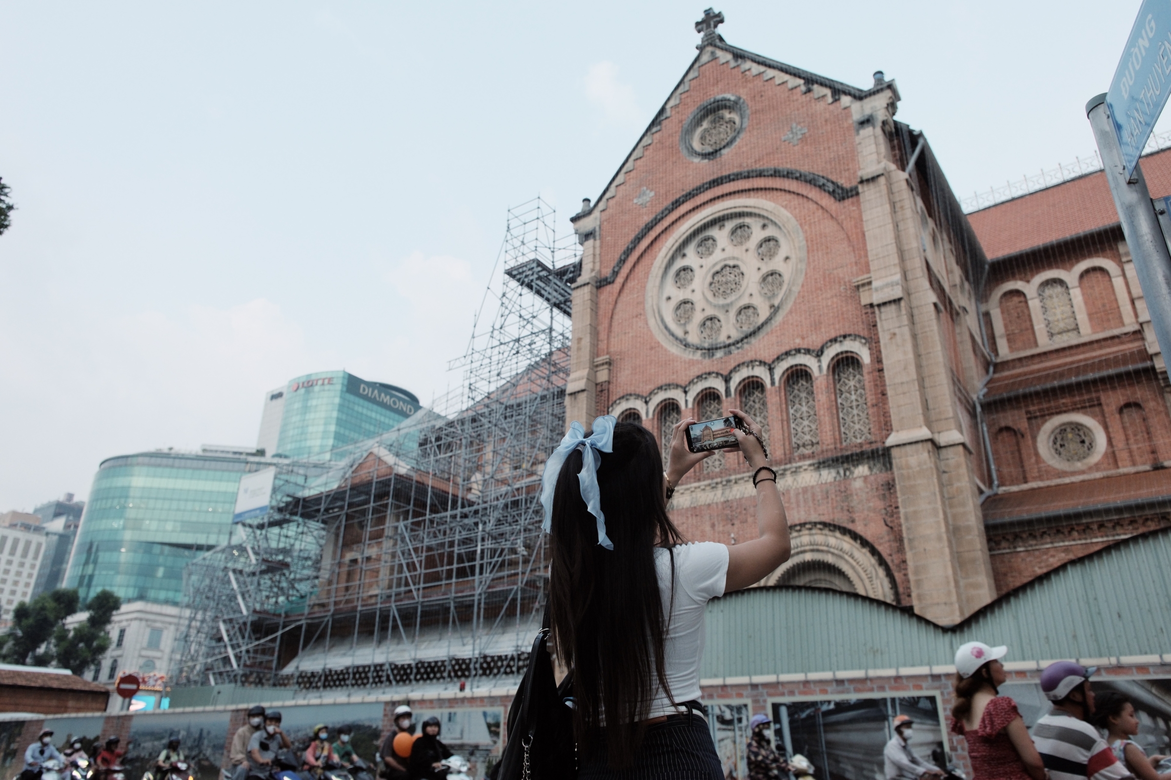 Daryl di chuyển đến khu trung tâm thăm Nhà thờ Đức Bà Sài Gòn, công trình biểu tượng của thành phố.